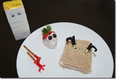 Lunch was a sand "witch”, white chocolate strawberry ghost, pretzel stick witches brooms and mummy juice. All of these ideas came from Pinterest.